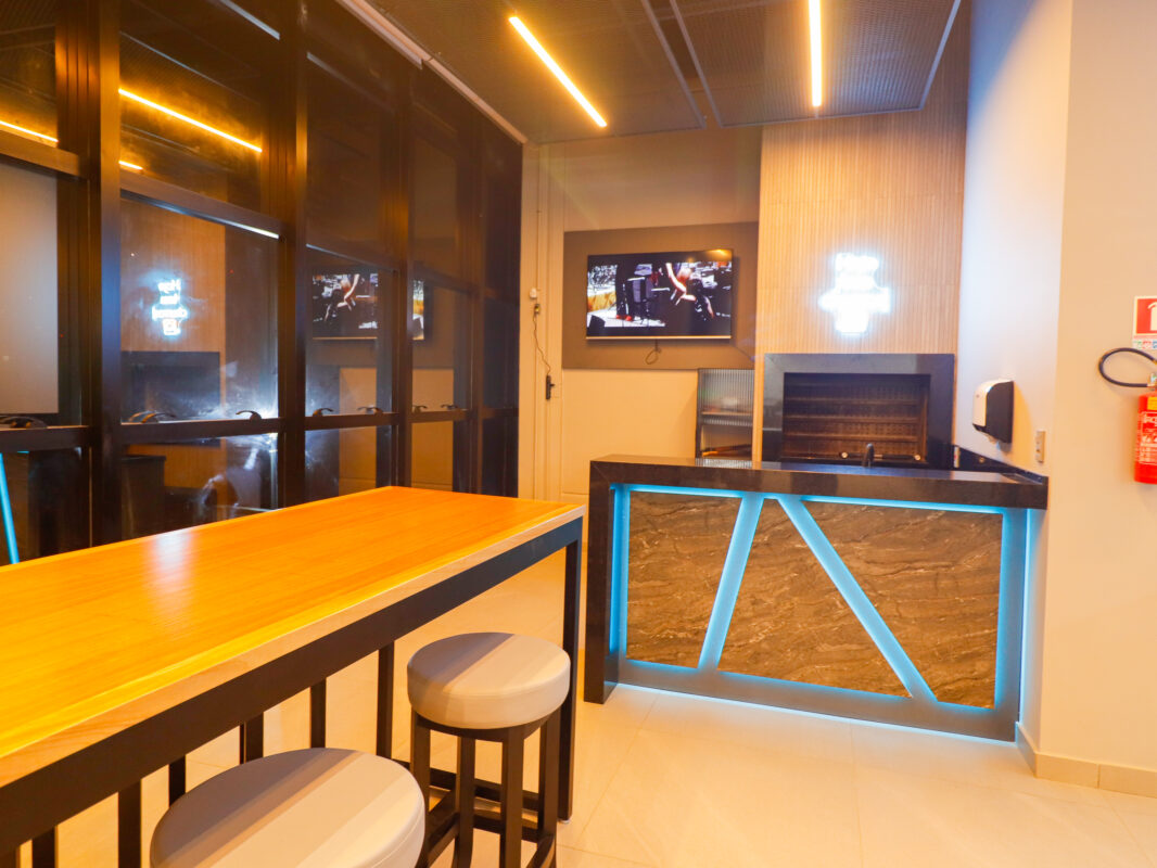 Um espaço agradável e acolhedor, com mesas, balcão, decoração temática, tela para jogos esportivos e som ambiente